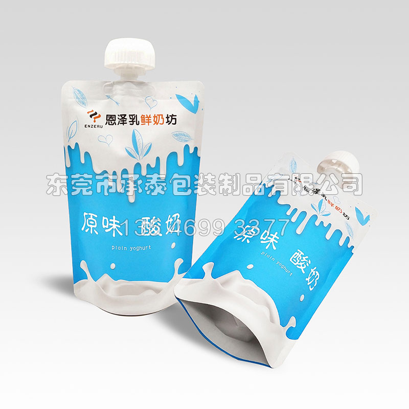酸奶自立吸嘴袋,食品級PE吸嘴,可直接接觸食品飲用,純鋁+隔味+尼龍等4層材質(zhì),強度好,遮光隔味。此袋型也常用于酒水飲料,果汁果凍,酸奶等包裝。