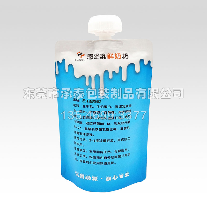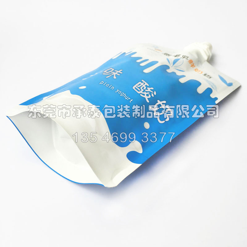 酸奶自立吸嘴袋,食品級(jí)PE吸嘴,可直接接觸食品飲用,純鋁+隔味+尼龍等4層材質(zhì),強(qiáng)度好,遮光隔味。此袋型也常用于酒水飲料,果汁果凍,酸奶等包裝。